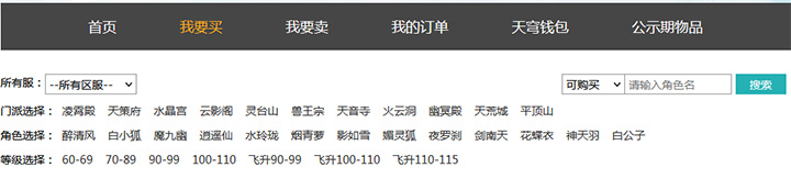 2、点击“我要买”按钮进入商品筛选页面,根据自己的喜好选择对应的区服、价格、门派、等级、角色等条件,点击“搜索”进行筛选。